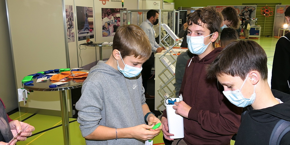Schon Donnerstag Vormittag herrschte Hochbetrieb. Zahlreiche Schülerinnen und Schüler wuselten maskenvermummt durch die Halle, um sich an den vielen Ständen über so unterschiedliche Berufe wie Logistiker, Automatiker, Kunststofftechnologe, Lackierer, Konstrukteur, Polymechaniker etc. zu informieren.