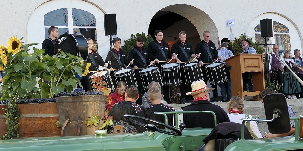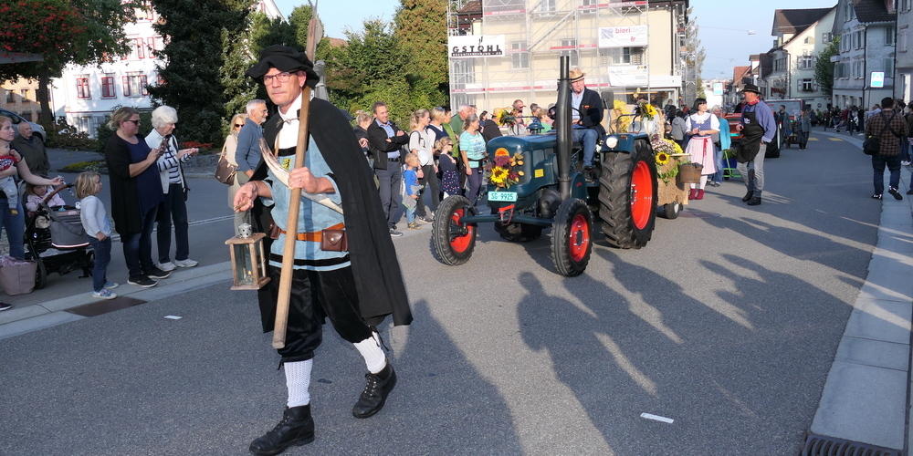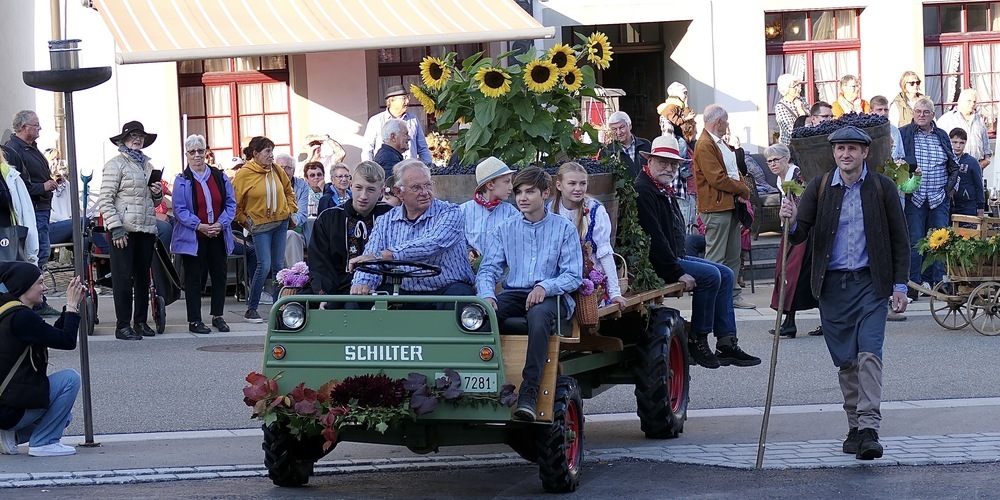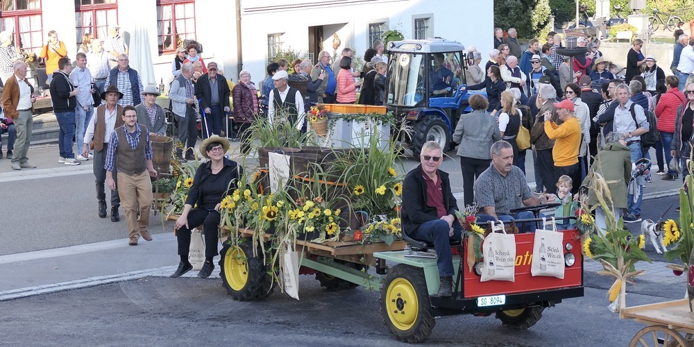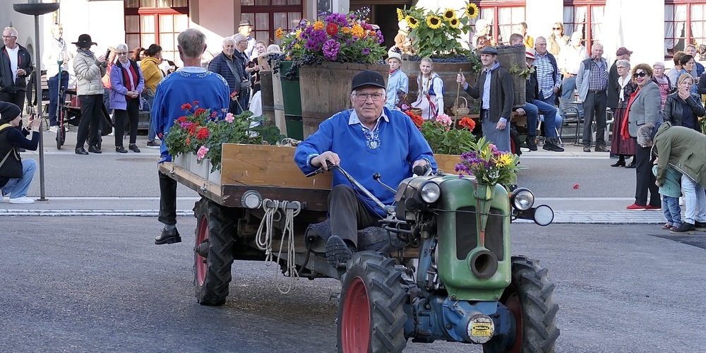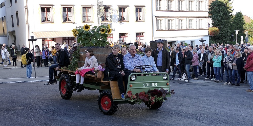 Die Weinbauern und ihre Helfer hatten sich im alten Winzerhäs herausgeputzt. Stilecht und stilsicher waren Kinder und Erwachsene in Tracht und Dirndl gekleidet. Dann setzte sich der Zug, angeführt von einem alten Lanz Bulldog Traktor mit dem Wagen und den Trauben des Weinguts Maienhalde in Bewegung.