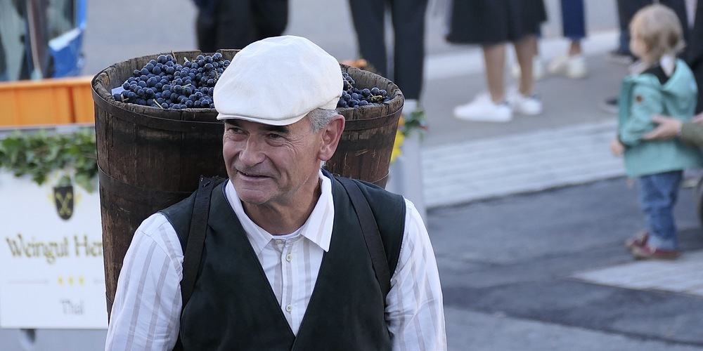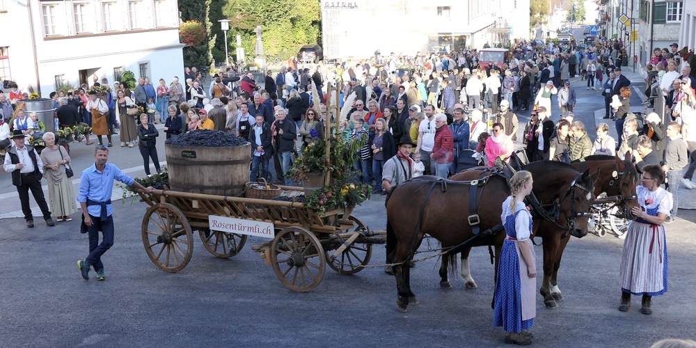 Schon einige Zeit vor dem offiziellen Beginn hatten sich die Winzer und Rebleute des ganzen Rheintals von Rüthi bis Thal in der Burggasse zu einem imposanten Aufzug formiert. Mit Blumen bunt geschmückte Fahrzeuge aller Art standen mit dunkelroten Pinot Noir Trauben beladen bereit.