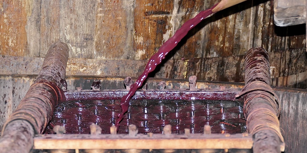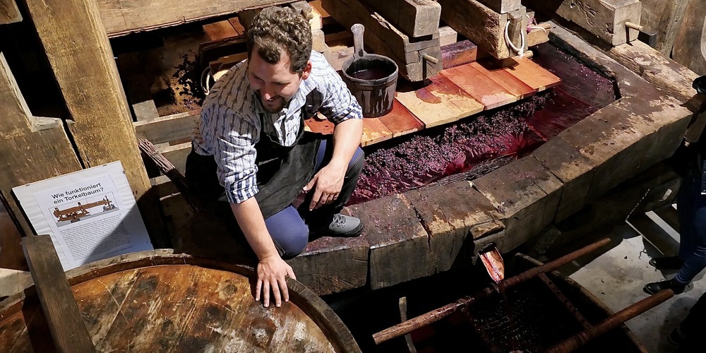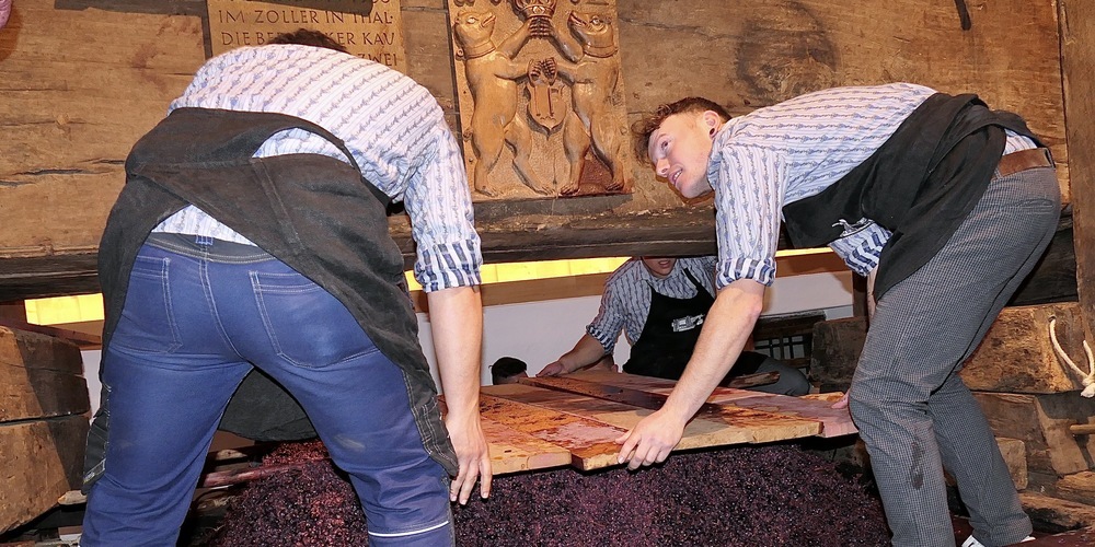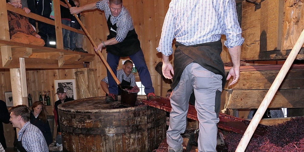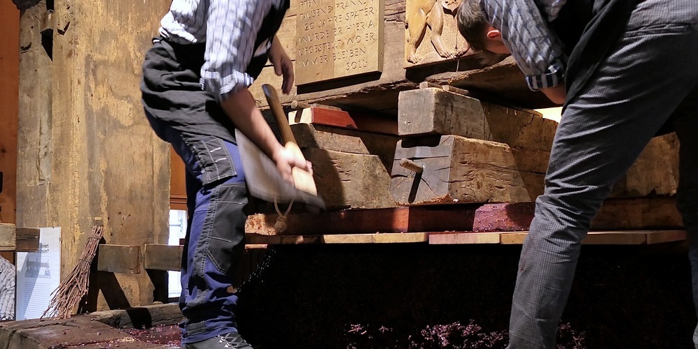 Was selbstverständlich der Fall war. Und so schöpften die Mannen unter der fachkundigen Leitung des Torkelmeisters das Traubengut aus dem riesigen Maischebehälter mit grossen Holzkellen auf das Torkelbett. Wobei schon viel gedruckter Traubensaft abfliessen musste, hatte doch das Gewicht der Trauben selbst die untersten Früchte im Maischefass bereits gepresst.
