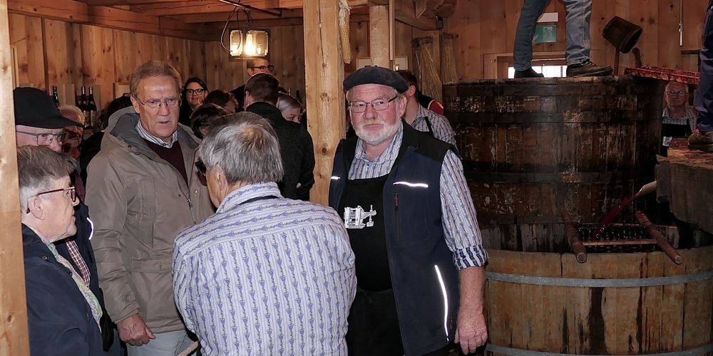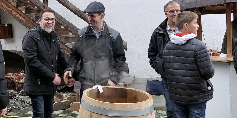 Ja, wer hätte das gedacht? Dass sich so viele Menschen dafür interessierten, wie mit einer über 300 Jahre alten «Maschine», nämlich einem alten, mächtigen Torkelbaum der Saft aus den vor einigen Wochen eingemaischten Blauburgundertrauben des Rheintals gepresst wird. Der Verein VINUM hatte als Veranstalter eingeladen. Und viele, sehr viele waren der Einladung gefolgt.