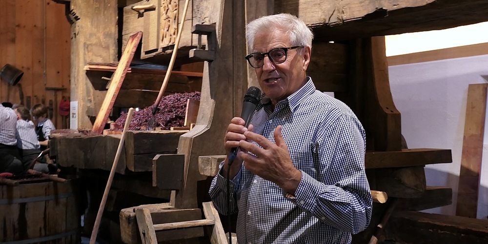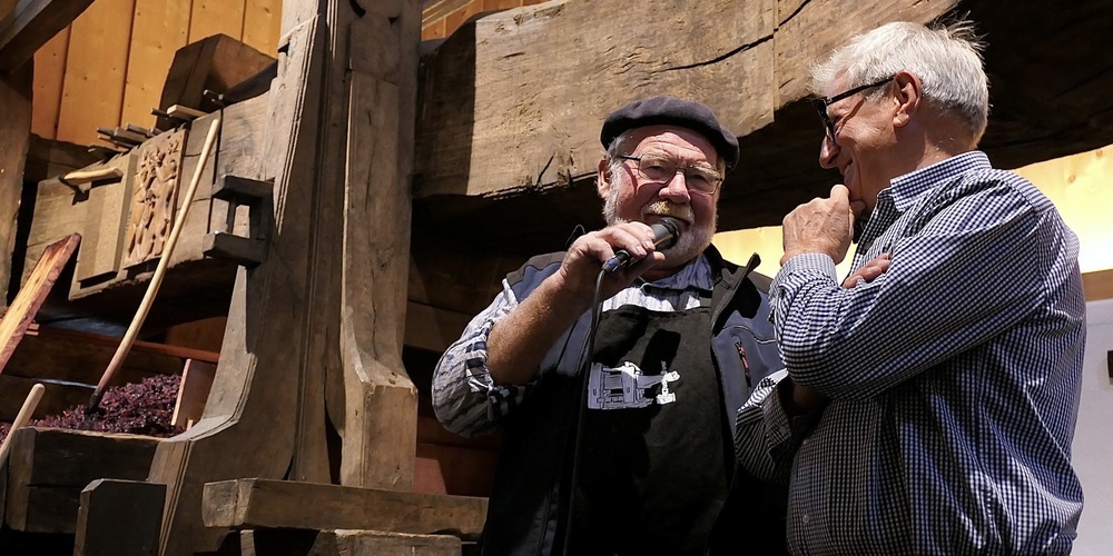 So erfuhren die Anwesenden, dass der alte Torkelbaum aus dem Jahr 1682 stammt und sich seit 1955 in Berneck und seit 1975 im Torkelgebäude neben dem Heimatmuseum befindet. Dass er zuvor bis 1930 wohl regelmässig im Betrieb war. Dass der Baum einen Druck von 27 Tonnen auf das Pressgut ausüben kann. Und dass es früher in Berneck bis zum grossen Dorfbrand rund siebzig hölzerne Torkelpressen gegeben hat.
