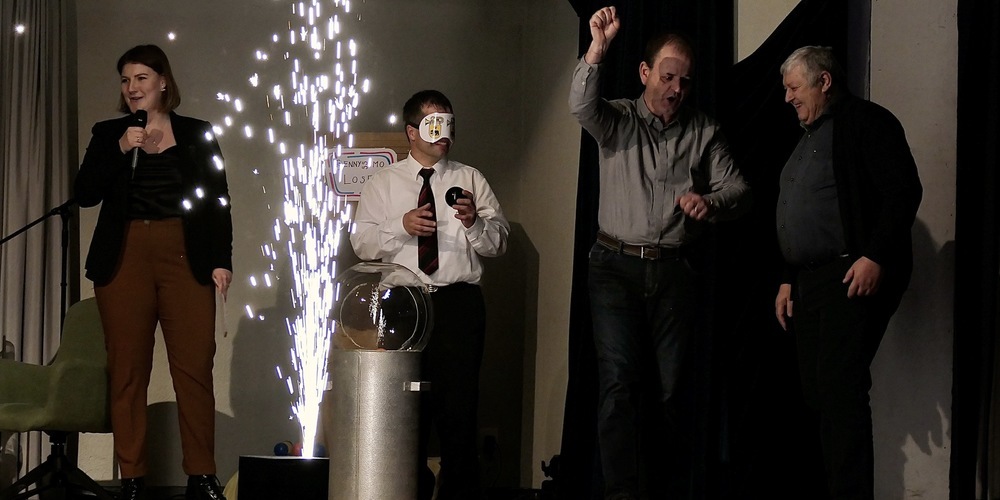 Anschliessend durften sie eine der acht grossen Kugeln aussuchen und öffnen. Darin befanden sich Gutscheine für Gewinne im Wert zwischen 120 und 200 Franken. Vom Fahrrad bis zu Riesen-Geschenkkörben. Dann mussten sich die Kandidaten entscheiden. Für den Sofortpreis oder dessen Ablehnung, womit man an der finalen Verlosung des Hauptpreises, eines 800 Franken-Reisegutscheins der Fa. Reisebüro Stieger, dabei war. Nur zwei Kandidaten blieben bis zum Schluss dabei.