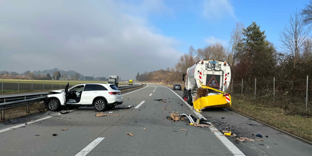 Infolgedessen fuhr sein Auto in den Anpralldämpfer der Arbeitsmaschine. Durch den Aufprall wurde das Auto weggedreht und prallte in die Mittelleitplanke. Der 64-Jährige wurde leicht verletzt und vom Rettungsdienst ins Spital gebracht. Es entstand Sachschaden im Wert von über 70'000 Franken.