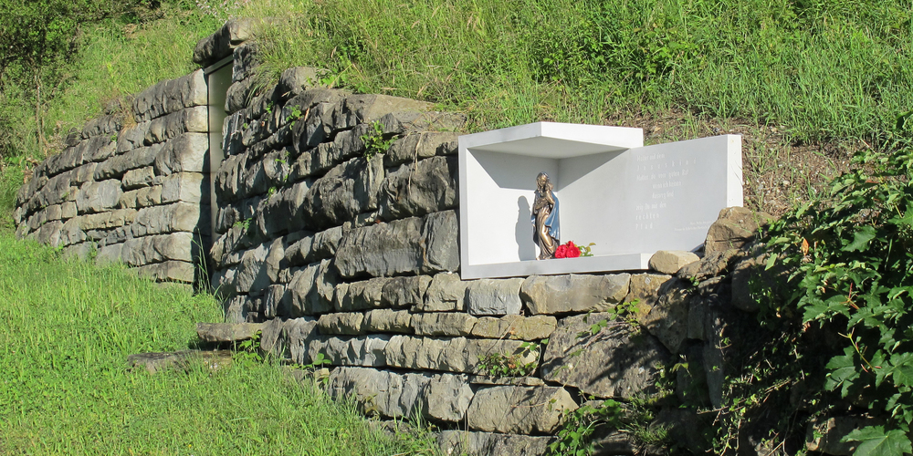Zur Realität wurde dieser Wunsch nach drei Jahren, in denen Architekt Matthias Waibel vom Büro Carlos Martinez Architekten eine moderne kleine Grotte in ein bestehendes altes Mauerwerk integrierte. In der Grotte befindet sich eine Marienstatue mit Kind, vierzig cm hoch und aus wetterbeständiger Bronze gegossen. Dieses Bildstöckli ist der Maria vom guten Rat gewidmet und wird am Sonntag, 16. August 2020, um 16.30 von Pfarrer Josef Benz eingeweiht. Mit anschliessenem Apéro.