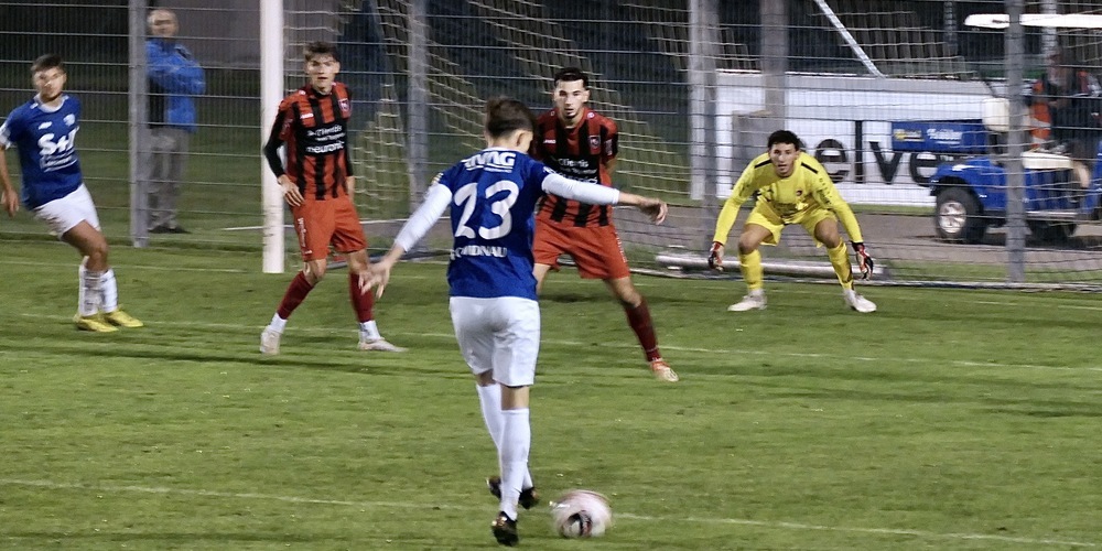 Eine weitere Parade konnte Lang nach etwa zwanzig Zeigerumdrehungen zeigen, als er einen tollen Schuss von Adis Mamuti im gestreckten Flug mit den Fingerspitzen noch zur Ecke ablenkte. Nur kurz darauf fiel der Führungstreffer für Blau-Weiss. Timon Cabezas, der an diesem Abend sein wohl bisher bestes Spiel für Widnau zeigte, setzte sich auf der rechten Aussenbahn mit Turbogeschwindigkeit durch, flankte flach und scharf zur Mitte, wo Lucas Barboza direkt verwandelte.