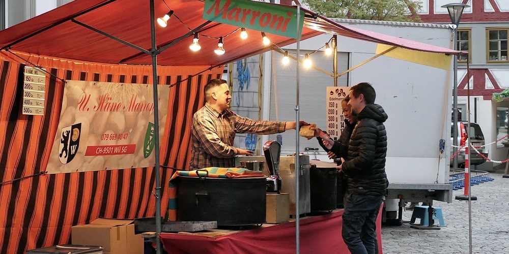 Und wer Sturm und Regen ebenfalls trotzte, waren die Kinder, die sich in der Drachenschaukel und bei der Kinder-Eisenbahn erfreuten. Was es dieses Mal nicht gab, war Soft-Ice. Denn wohl erstmals an einem Markt in diesem Herbst machten die Marroni-Brater und Glühweinverkäufer ein richtig gutes Geschäft.