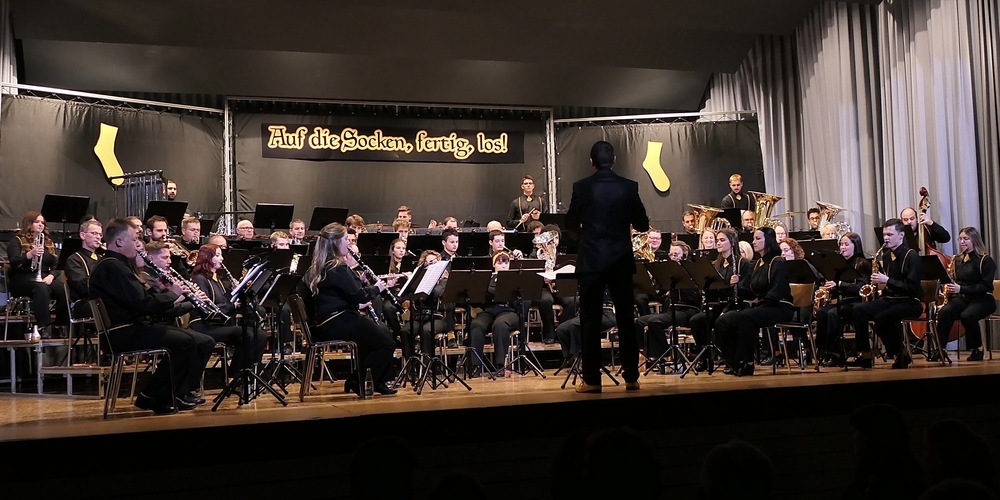 Warum gelbe Socken? Weil in der Begleitgeschichte des Abends, die zwischen den einzelnen Nummern erzählt und gespielt wurde, zwei gelbe Socken auf der Reise zu ihrer musikalischen Bestimmung waren. Und dabei auf bekannte Figuren aus der Weltgeschichte trafen. Wie auf Tarzan, Cäsar oder Aladdin. Mehr sei nicht verraten, denn vielleicht wollen sich einige unserer Leser das Geschehen ja heute noch selbst vor Ort zu Gemüte führen.