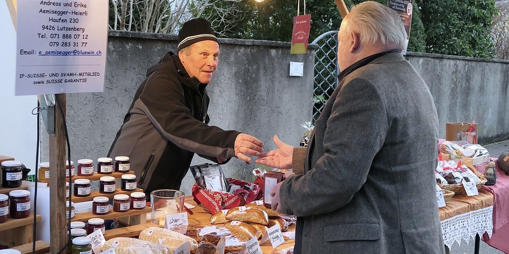 Und da war da noch der Lutzenberger Landwirt und Fleischzüchter Andreas Aemisegger, der seine selbst produzierten Köstlichkeiten anbot. Bison-, Wasserbüffel-, Angus- und Beef-Fleisch und alle möglichen Geschenk-Variationen mit Konfis oder Dörrbirnen und vieles andere. Aemisegger legt Wert darauf, dass er Appenzeller Bauer ist und deshalb auch kein Bündner, sondern das viel zartere Appenzeller-Fleisch verkauft.