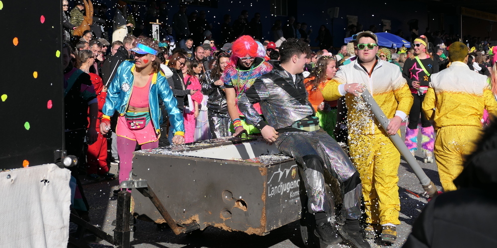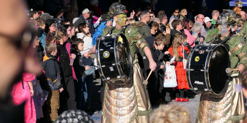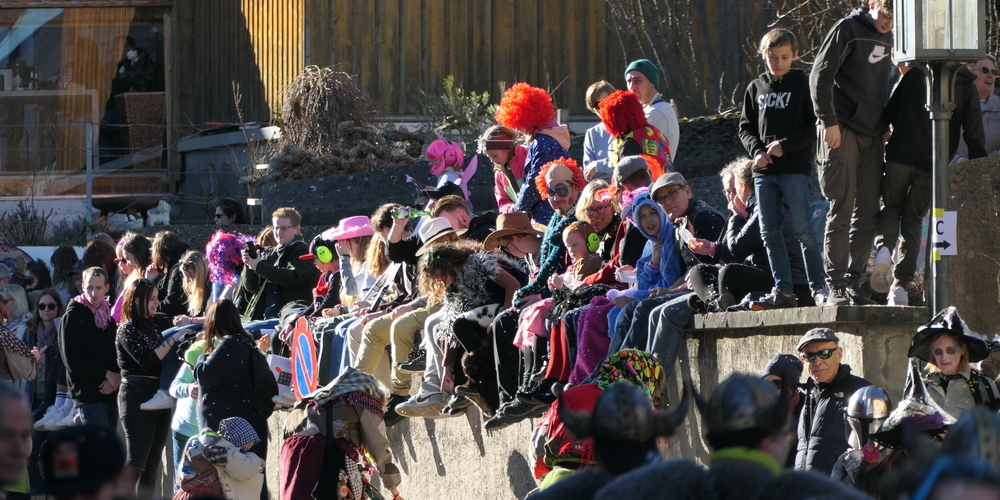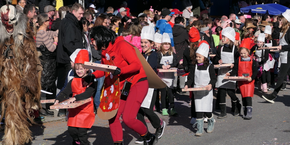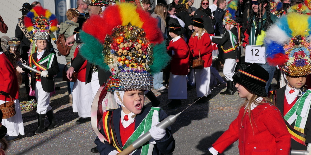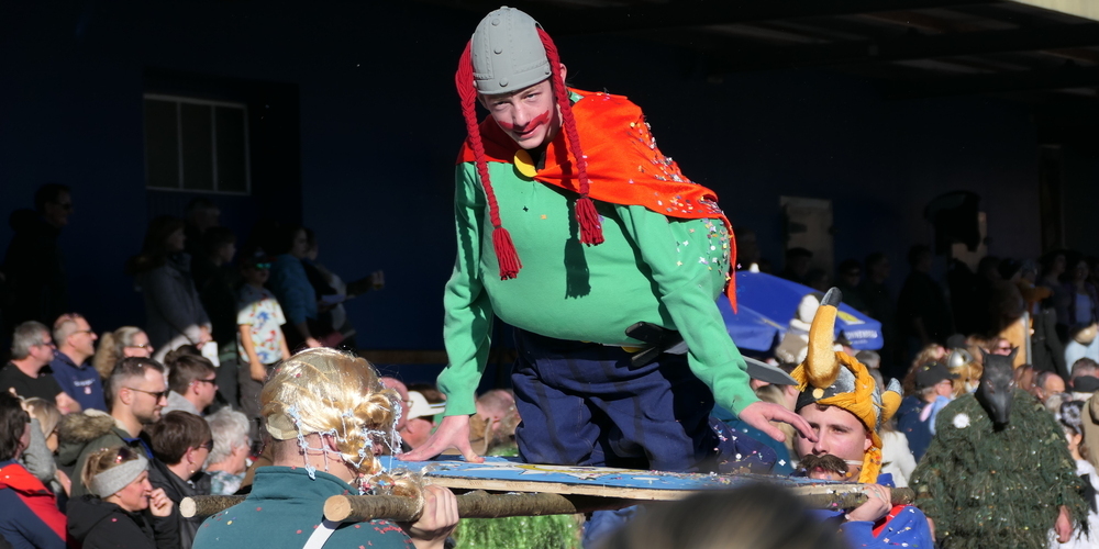 Sie alle schmetterten ihre schrägen Töne gegen den strahlend blauen Himmel. Weitgehend sinnbefreite Musik, die aber automatisch gute Laune macht. Wie auch die aufwändigen Kostümierungen der Pseudomusikanten. Überhaupt war gute Laune wieder einmal Trumpf. Und besonders die vielen Kinder, die kleinen Prinzessinnen, Cowgirls und Cowboys und Spidermans, hatten ihre helle Freude. Machten mit beim munteren Konfettischmeissen. Und versuchten, so viele Bonbons und Lutscher wie möglich zu ergattern.