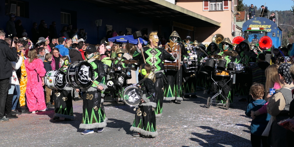Neben weiteren Schauergruppen, wie den Ribelbüüchwiiber oder Räbafägern, neben den Umzugswagen und Kostümgruppen nahmen selbstverständlich auch viele Guggenmusiken am Räbschter Fasnachtsumzug teil. Das ganze Rheintal war vertreten. Bleandastöber, Lavaria, Guggesuuser, Rhi-Jooli und wie sie alle heissen.