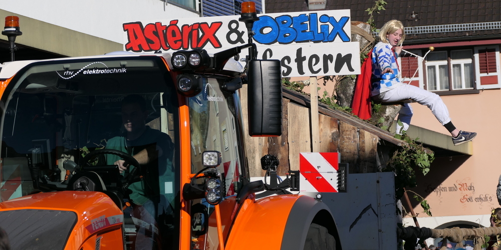 Aufwändig und originell gestaltet war der Wagen «Asterix und Obelix bei den Räbschtern». Wobei Obelix tatsächlich einen Hinkelstein dabei hatte und Sänger Troubadix wie in den Comicalben auf einem Baum sass und seine Leier schlug.