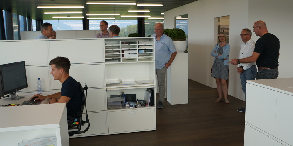 Gemeindepräsident Rolf Huber zeigte sich beeindruckt: „Ich bin immer wieder erstaunt, wie innovativ und vielseitig unsere kleinen und mittleren Betriebe doch sind. Die Lüchinger Metallbau AG hat mit dem Neubau und den neuen Büros freundliche, helle und top moderne Arbeitsplätze geschaffen. Mit einem weitgehend papierlosen Organisationsablauf. Die haben mit diesem auf alle Seiten offenen Grossraumbüro wirklich etwas für die Mitarbeiter gemacht.“