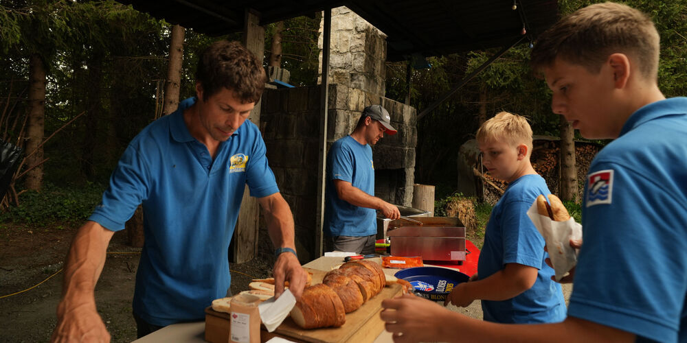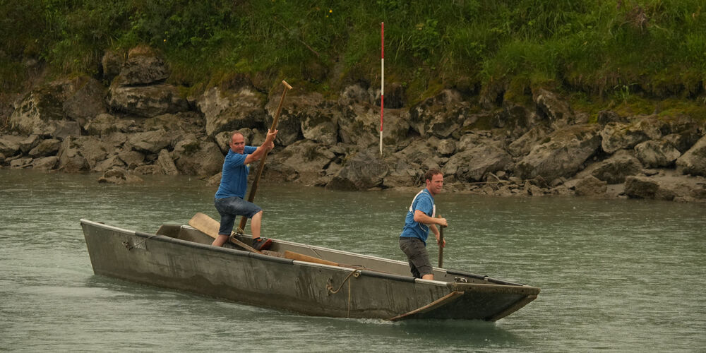 Am Mittag war alles bereit und die Pontoniere konnten zusammen mit den Gästen den wohlverdienten Zmittag geniessen. Der Fahrchef, Sandro Gschwend, erklärte den Parcours, der zweimal gefahren werden musste.
