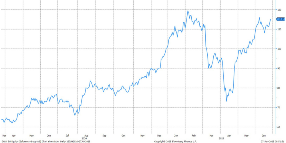 Galderma ist seit März 2024 an der Schweizer Börse gelistet. Neben Sonnencremes wie "Daylong" vertreibt das Hautpflege-Unternehmen auch Medikamente gegen Hautkrankheiten wie Akne, Schuppenflechte oder Rosazea. Produkte gegen Hautkrebs gehören ebenfalls zum Portfolio. Das Unternehmen ist überraschend schwungvoll ins Geschäftsjahr 2025 gestartet. Im 1. Quartal 2025 setzte Galderma USD 1.13 Mrd. um, ein Anstieg um 5.4%. Zu konstanten Wechselkursen lag das Plus bei 8.3%.
