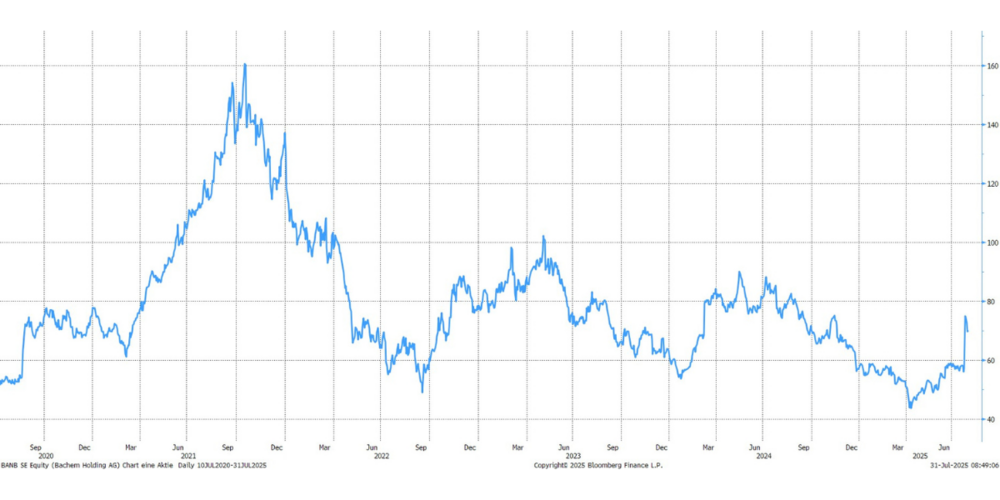 Bachem ist ein Schweizer Chemieunternehmen mit rund 2'200 Mitarbeitenden und einer globalen Präsenz mit Standorten in der Schweiz, Deutschland, den USA, UK und Japan. Das Unternehmen ist Weltmarktführer bei der Herstellung von Peptiden. Für das 1. Halbjahr 2025 gelang es Bachem überzeugende Zahlen zu erreichen. So erhöhte sich der Umsatz im Vorjahresvergleich um +30% auf CHF 313 Mio. Bachem produzierte effizienter auf den bestehenden Anlagen. Zudem läuft der Ausbau der neuen Kapazitäten nach Plan.