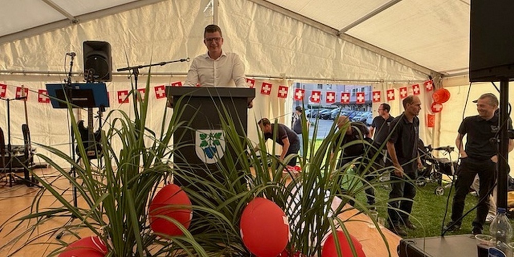 Nach den musikalischen Darbietungen betrat Gastredner Mike Egger, SVP-Nationalrat, das Podium. Für ihn ist der 1. August ein besonderer Tag: Einerseits feiert die Schweiz ihren Geburtstag, andererseits hat er selbst am 2. August Geburtstag. Das sei «eine doppelte Gelegenheit zum Feiern». Seine Rede zum Nationalfeiertag begann er mit einem Zitat von Mark Twain: «Eine gute Rede hat einen guten Anfang und ein gutes Ende, und beide sollten sehr nahe beieinander liegen.»
