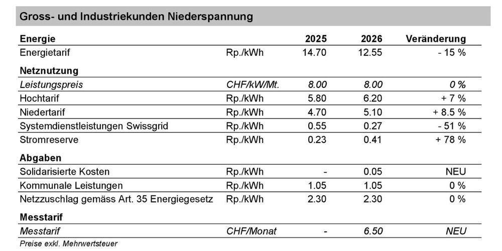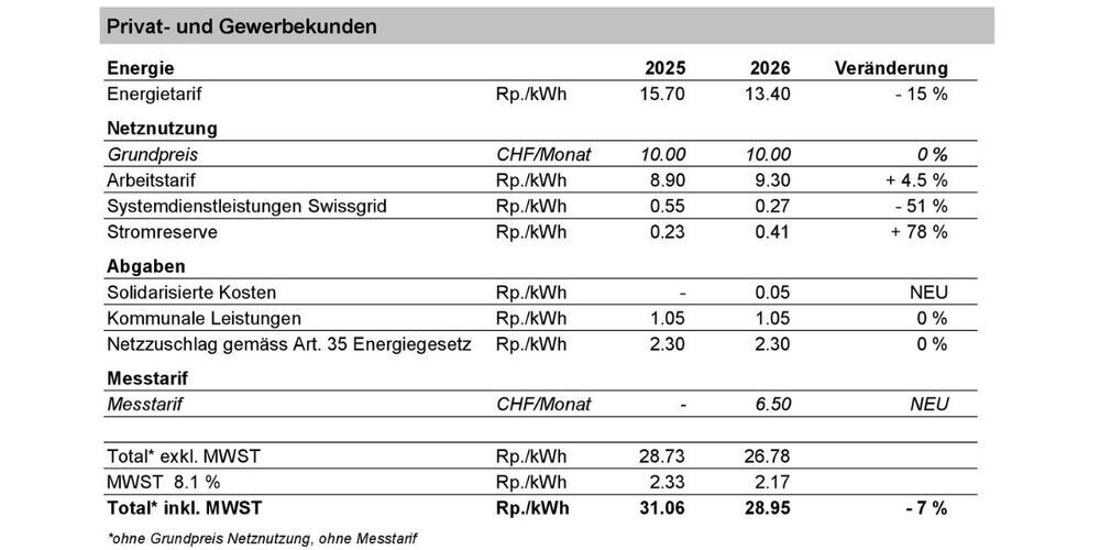 Dem tieferen Einkaufspreis entsprechend wird der Energietarif 2026 gegenüber 2025 um 15 Prozent gesenkt.
