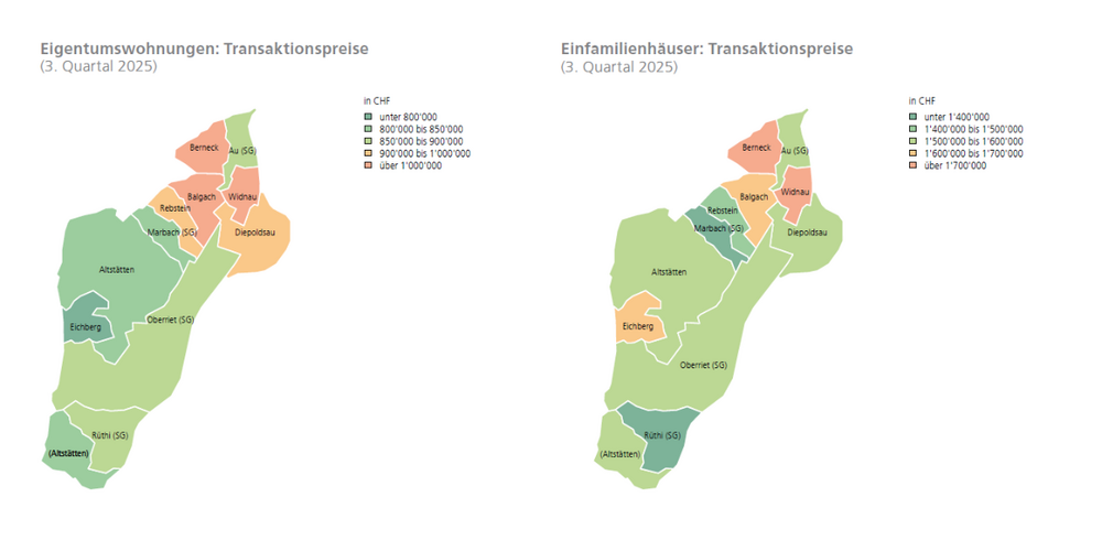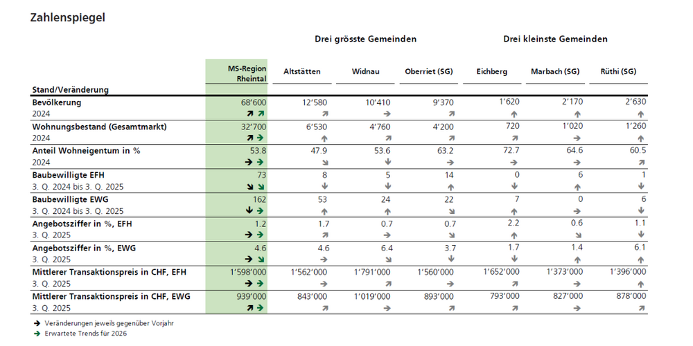 Einfamilienhäuser bleiben im Rheintal knapp: Nur 1.2 Prozent des Bestands standen im dritten Quartal 2025 zum Verkauf. Der Markt für Stockwerkeigentum ist entspannter. Aufgrund reger Neubautätigkeit umfasste das Angebot zuletzt 4.6 Prozent des Gesamtbestands, auch wenn dieser Wert leicht rückläufig ist.
