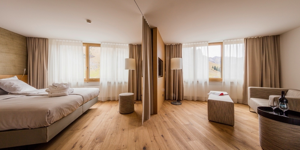 Mit einer Investition von 42 Millionen Franken und einer Bauzeit von zweieinhalb Jahren entstand ein beeindruckender Betonskelettbau, der sich harmonisch in die alpine Landschaft einfügt. Nachhaltigkeit war von Beginn weg zentral: Der Beton wurde aus Aushubmaterial der Baustelle hergestellt. Dadurch konnten rund 3000 Lastwagenfahrten sowie 80’000 Liter Diesel eingespart werden. Zudem decken 30 Erdsonden rund 75 Prozent des Energiebedarfs des Hotels.