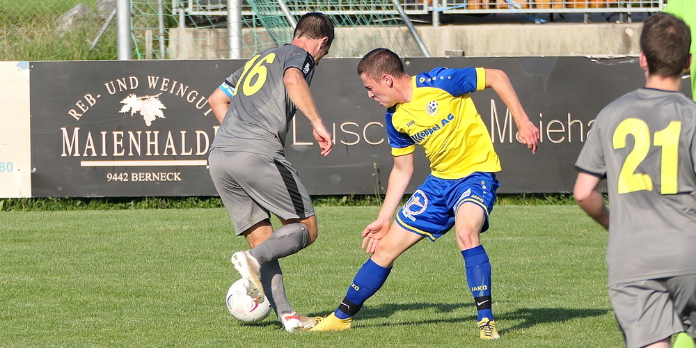 Au-Berneck 05, das dringend auf einen erlösenden Sieg wartet, begann den Match mit einem Paukenschlag. Die Hafner-Schützlinge waren von der ersten Sekunde an lästig wie Bremsen und giftig wie Wespen. Die Gästespieler wurden attackiert, sobald sie den Ball am Fuss hatten. Wach und aggressiv, so soll es auch sein.