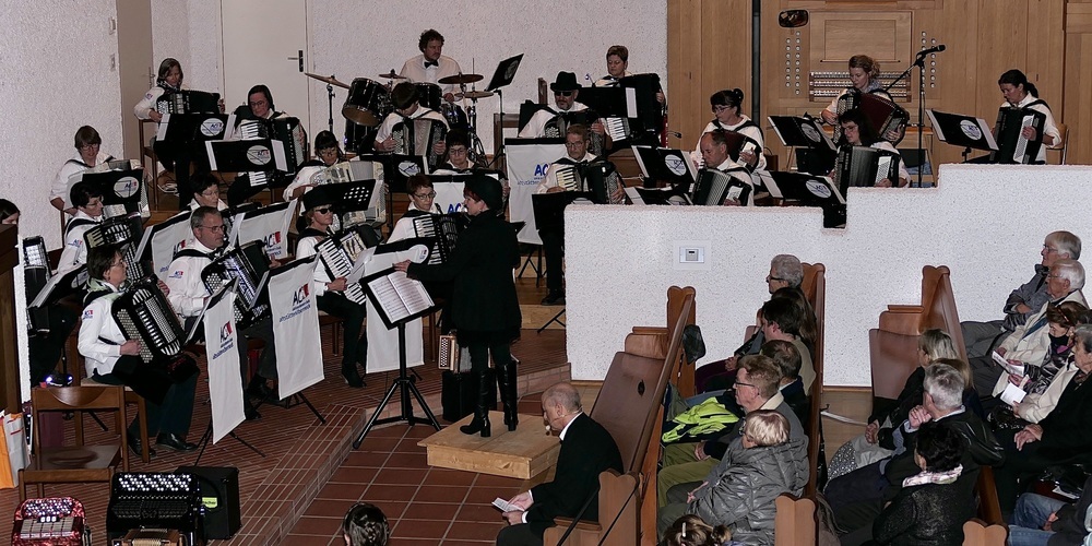 Da flogen die Finger der 23 Akkordeonspieler über die Knöpfe oder Tasten ihrer schweren Instrumente, da wurde mit zügigen Armbewegungen die Luft durch die Stimmstöcke und –platten und die Ventile gepresst. Damit wurde ein wunderbarer, schwereloser Sound erzeugt, ergänzt durch einen stets gefühlvoll im Hintergrund bleibenden Schlagzeuger. Und durch die Höhen und Tiefen der Musik geführt durch Dirigentin Petra Rieger.